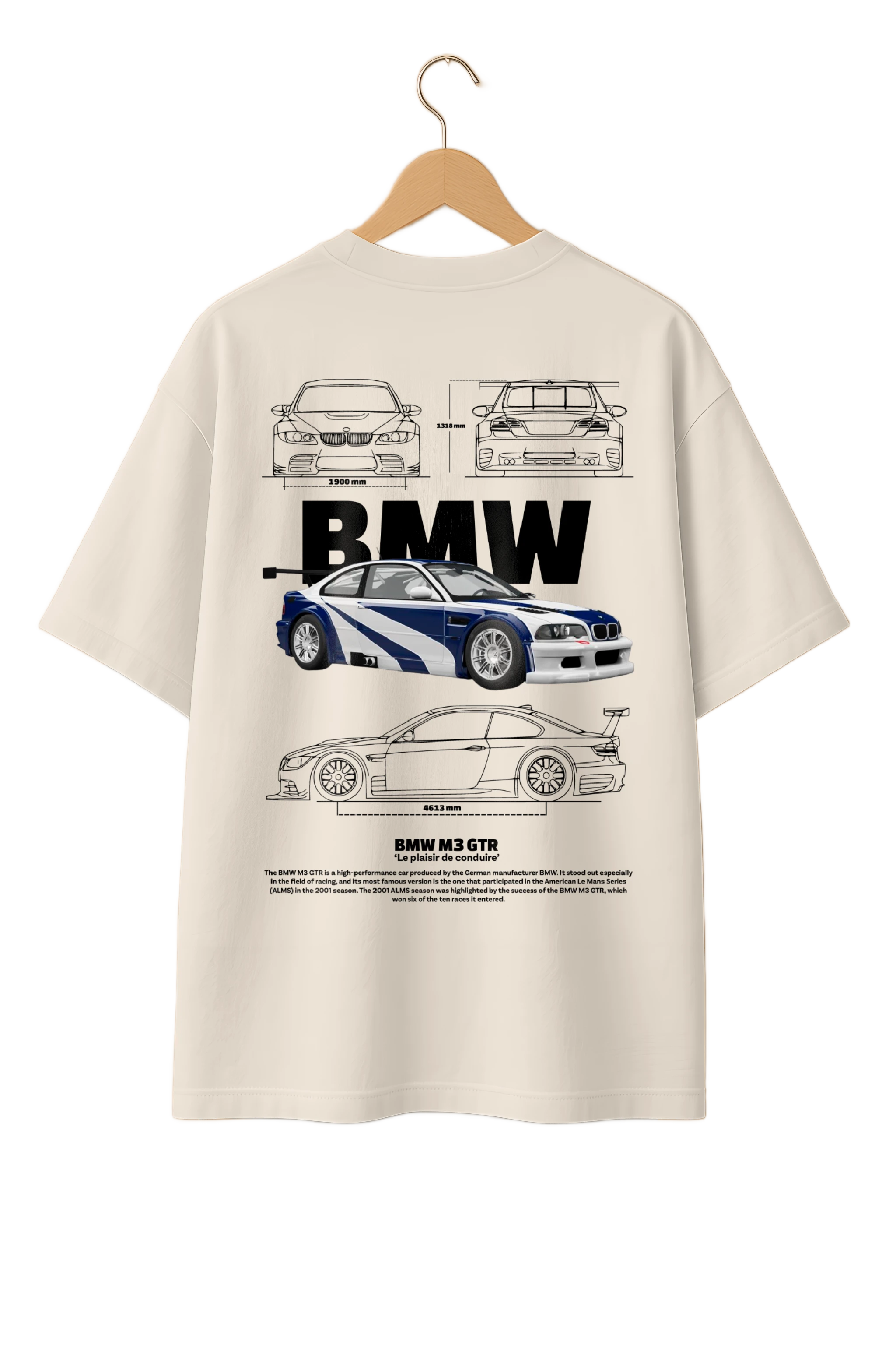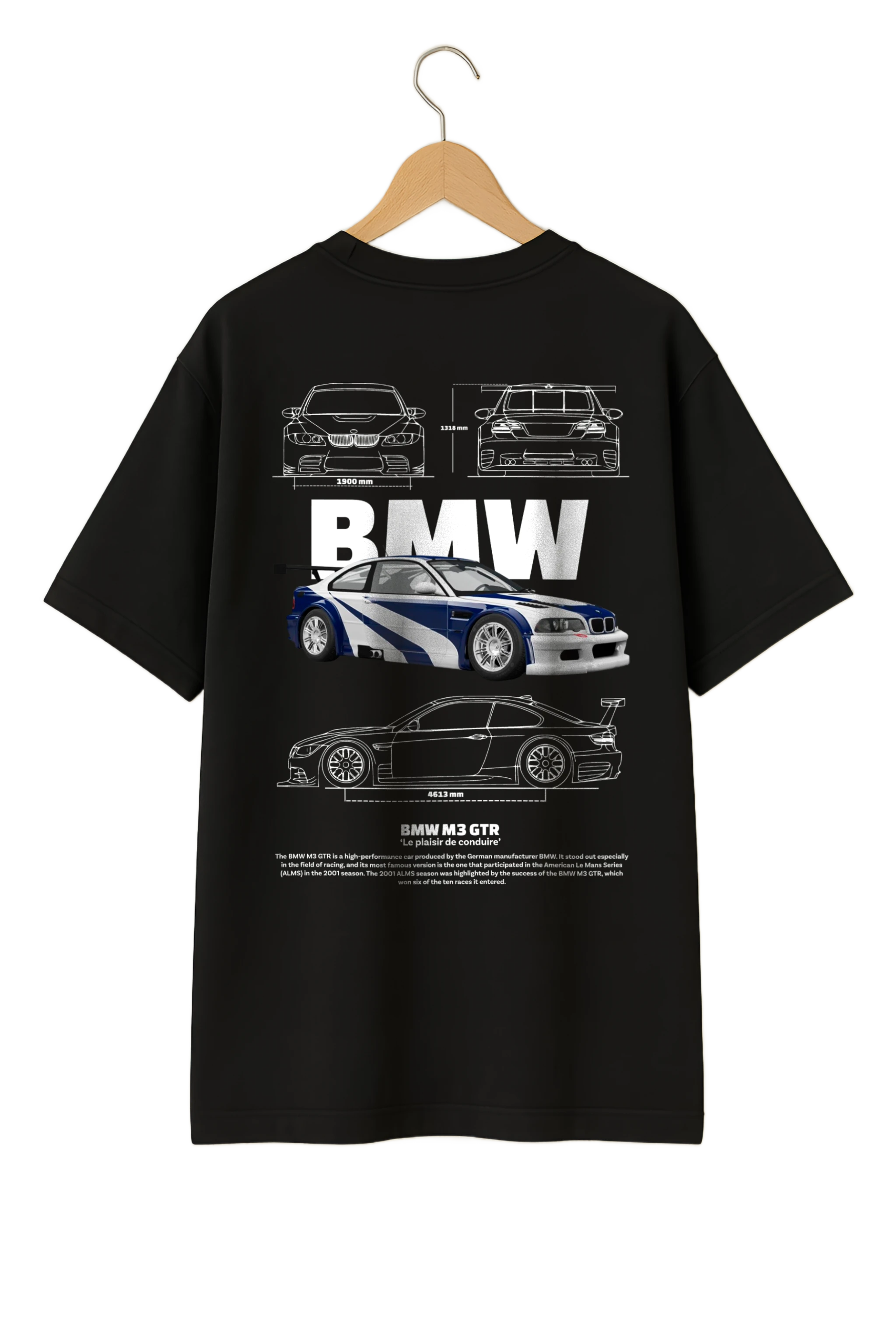 Show your passion for BMW motorsport heritage with this premium oversized T-shirt featuring the legendary BMW M3 GTR. The back print showcases detailed blueprint-style illustrations of the car, including its front, rear, and side views, paired with a bold BMW logo and iconic race livery.